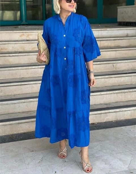Introducing our Solid color imported embossed scallop cotton dress, designed for the modern woman who values sophistication and style. This dress features a stunning print and elegant maxi length, making it perfect for any occasion.